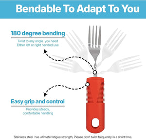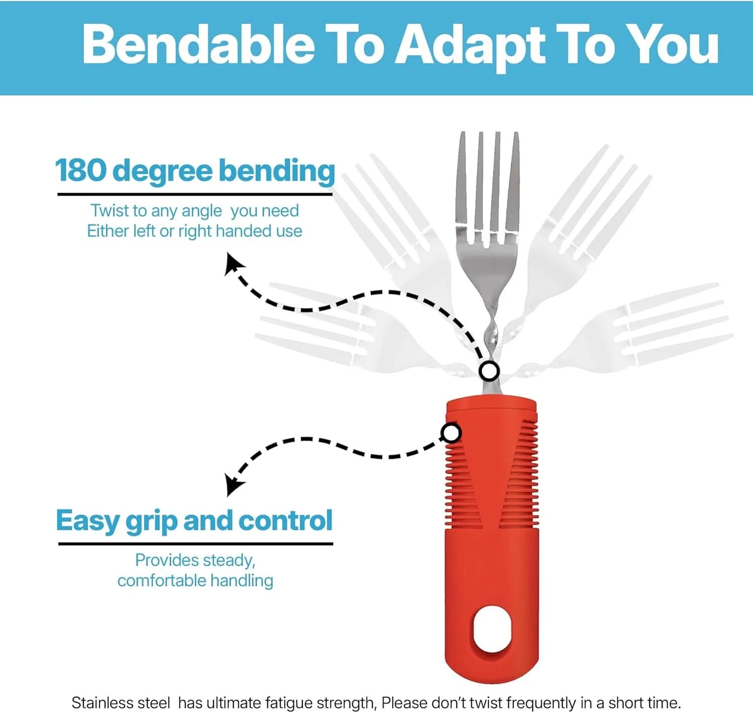 Each utensil features a soft-touch, enlarged handle that provides stability and comfort, helping improve control and confidence while eating. The utensils can be bent up to 180 degrees, allowing users to customize the angle to suit their range of motion and preferred hand position.