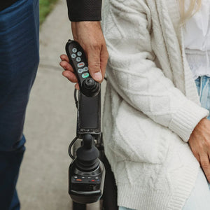 The AEROLUX Caregiver Remote offers added peace of mind and convenience for both caregivers and users. With wireless Bluetooth connectivity, it allows caregivers to steer and maneuver the Travel Buggy with ease, creating a smoother and more relaxed shared experience. The compact, ergonomic design makes it comfortable to hold and simple to use, while the responsive controls provide reliable handling without needing to reach the chair’s joystick. Compatible with all AEROLUX Series power chairs.