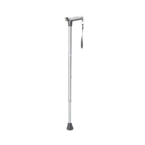 The Airgo Comfort-Plus Aluminum Cane with Derby Handle offers a reliable and comfortable walking aid for individuals needing extra balance and support. Designed with a cushioned Comfort-Plus handle, it effectively absorbs shocks, making it especially suitable for those with arthritis. Its clever handle design grips walls, preventing accidental falls when leaned against a surface. With 12 easy-to-adjust push-button height settings, it ensures a customized fit for users ranging from 5' to 6'5". Constructed from ultra-durable, lightweight anodized aluminum, this cane offers long-lasting strength without unnecessary weight. Safety is a priority with its included cane strap featuring a reflective patch for enhanced visibility at night, and the treaded rubber Flex-Grip tip delivers superior traction on various surfaces.