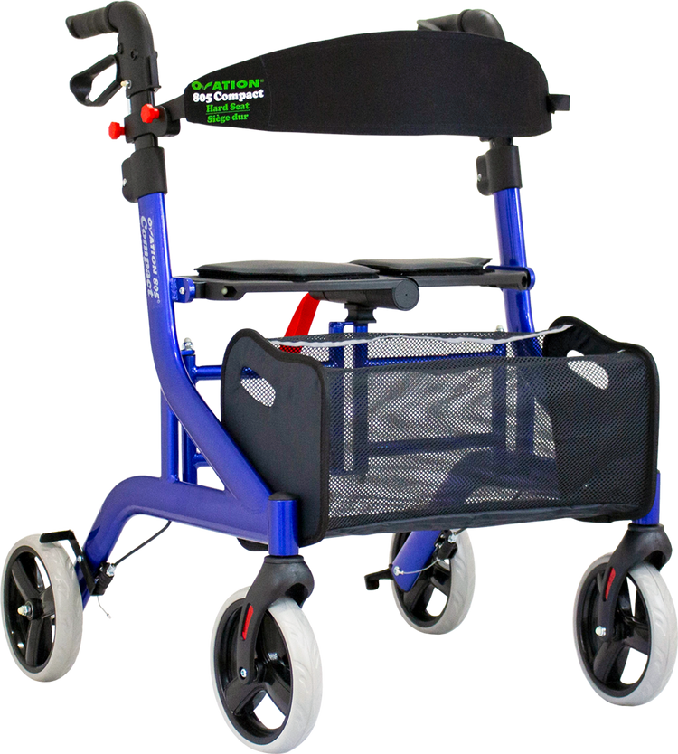 The Ovation 805 Compact Walker offers a strong, dependable design with thoughtful features for everyday comfort and convenience. Built with durable oval-shaped tubing, it provides added strength without extra bulk. The padded seat and removable backrest offer a comfortable place to rest, while internal brake cables and dual locking brakes support safe stopping and control. Its 8" casters move smoothly over indoor and outdoor surfaces, and the push-button handles make it easy to adjust the height.