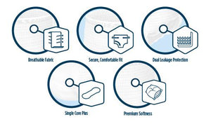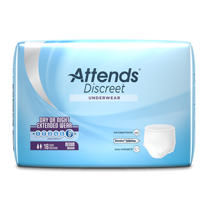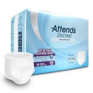 Attends Discreet Day/Night Extended Wear Underwear is our most absorbent product in the Attends Discreet line. Featuring our high performance DermaDry™ Technology and 30% more absorbent capacity to lock in wetness and keep skin feeling dry and healthy. Now including - barrier leg cuffs, odor shield, partial belly elastics, and a comfortable stretch waistband for a secure fit. With the added protection of barrier leg cuffs, Attends Discreet Day/Night Extended Wear Underwear is suggested for moderate to heavy incontinence. Tear-away side panels make removal fast and easy.