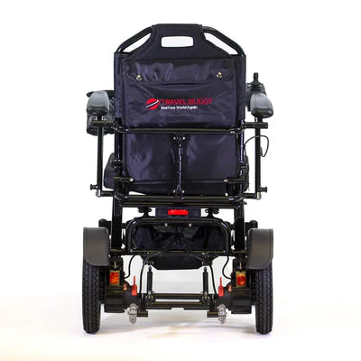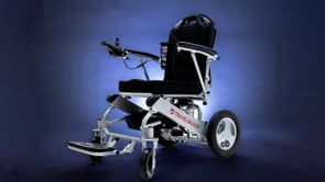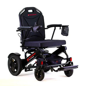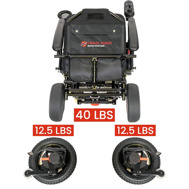- Full-sized power chair with removable quick-release wheels for lighter, compact transport