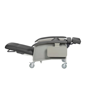 This clinical care Geri chair recliner by Drive Medical is ideal for use in dialysis, blood collection, respiratory and cardiac care. It shifts into four positions: upright, TV, full recline and Trendelenburg. Both recline and Trendelenburg positions are controlled by a gas cylinder and can only be attained by an attendant and a convenient release handle can be operated from either side of the recliner. The product includes a large, blow-molded tray that includes a recess for a cup. The comfortable "built-in" headrest and wide, comfortable, padded arm rests were constructed at an angle to provide support, even in a reclined position. The 5" casters (2 complete with locks) allow for simple movement and security of the recliner. With a neutral-colored, sturdy steel frame, the chair is easy to clean and maintain, with side panels that pop off for cleaning and maintenance. All foam and vinyl meet California Flammability standards, and the product also meets both standard and Boston Fire Department specifications. It includes a weight capacity of 250 pounds.