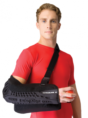 The UltraSling III provide immobilization for rotator cuff repairs, capsular shifts, Bankhart repairs, glenohumeral dislocations/subluxation and soft tissue repairs/strains. The De-Rotation Strap hooks to the UltraSling III and prevents internal rotation by securely holding the patients arm in neutral position.