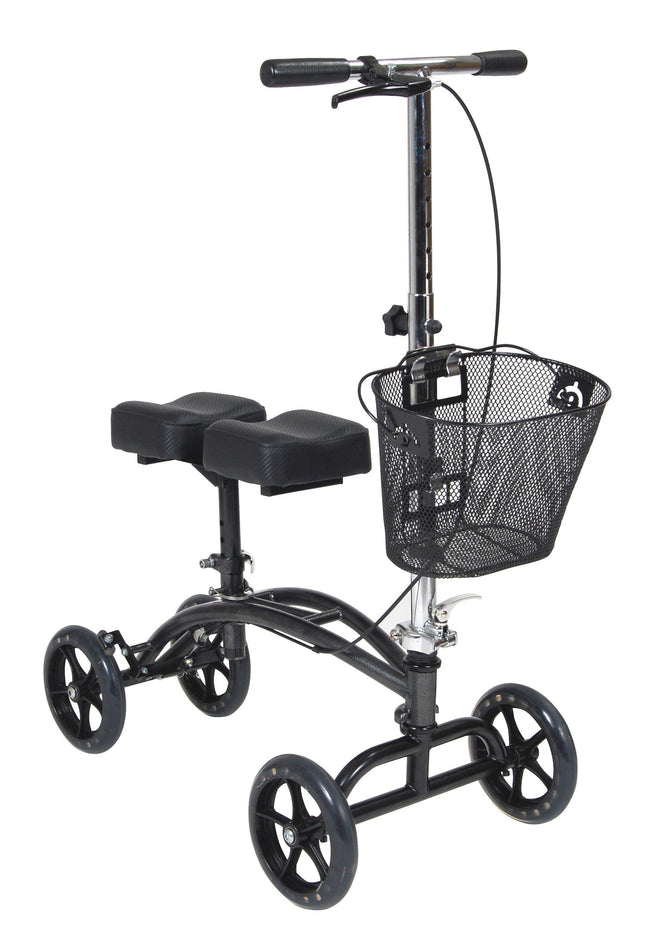 I rented this knee walker to avoid weight bearing on a badly fractured ankle and found it easy to use and super convenient. Made scooting across the house and around the kitchen a breeze as it is super manuverable and it glided over the many thresholds in my house. The basket was a huge bonus. Don't know how I would have managed without it!