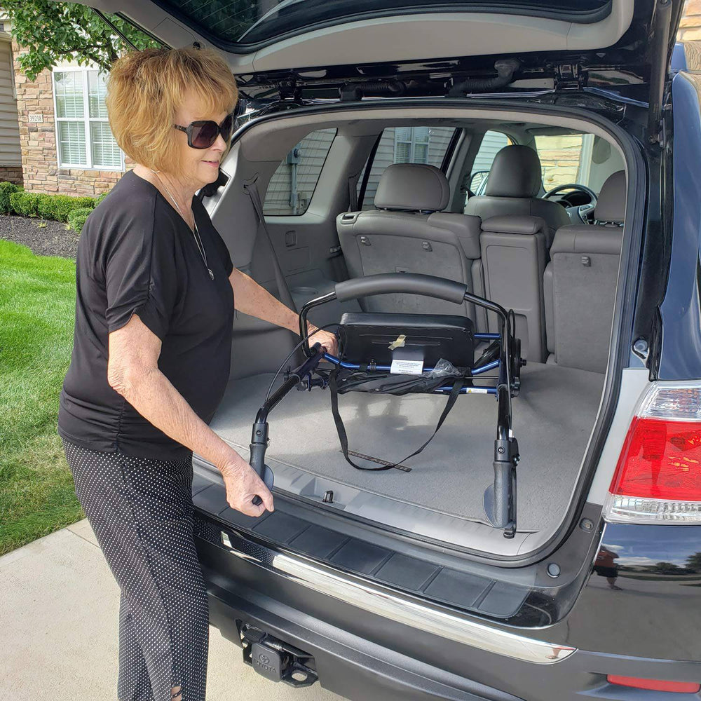 This rollator is height-adjustable from 31" to 37", allowing a tailored fit for different users. With its quick-folding design, it collapses easily for compact storage or transport. The 6-inch non-marring wheels glide smoothly indoors or outdoors without scuffing floors. A built-in nylon pouch under the seat keeps personal belongings close at hand. With a 300 lb weight capacity, this heavy-duty walker delivers lasting mobility support for everyday life.