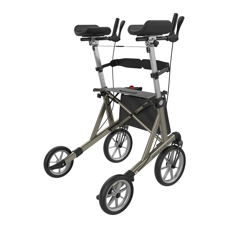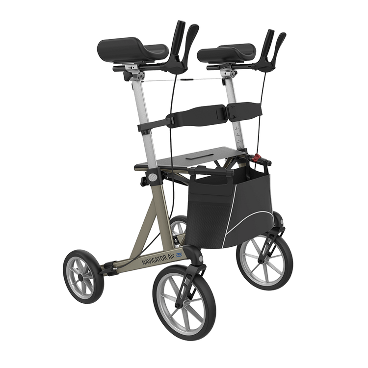The Navigator Air Forearm Rollator by Rehasense combines style, comfort, and stability in a lightweight design built for daily use. Designed with Scandinavian principles, it features a smooth, stable frame with large front wheels and a longer wheelbase that helps you navigate uneven surfaces with ease. The ergonomic forearm supports and built-in backstrap offer added safety and support, while the adjustable handle height ensures a proper and comfortable walking posture. A large shopping bag, patented "Click & Safe" folding system, and self-standing function make this rollator practical at home and on the go. Reflective elements enhance visibility in low light, and it’s compatible with a full range of accessories to suit your lifestyle.