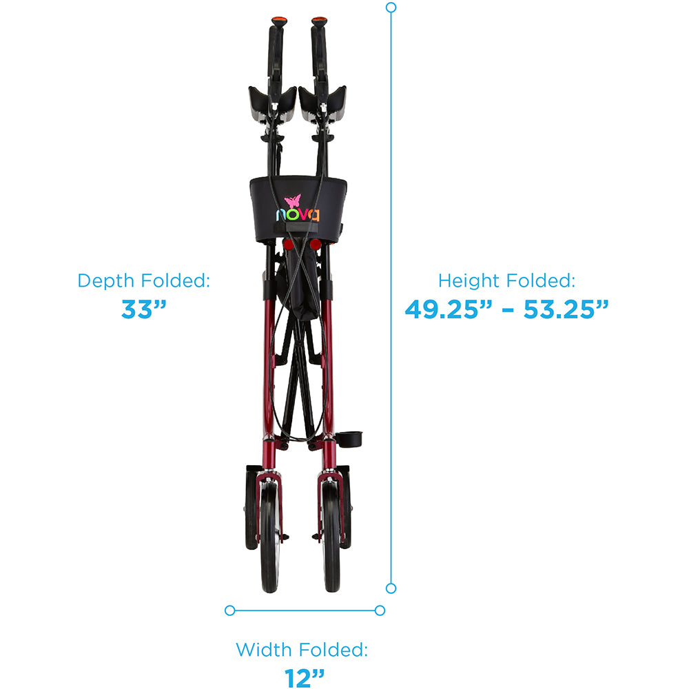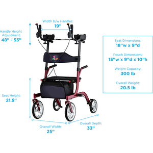 The Phoenix Rise Up Rollator helps you move with confidence, comfort, and a forward-looking posture that eases body strain and fatigue. Its design supports an upright walking position while giving you stability and control so you can enjoy your daily walks, errands, or outings with less effort. The padded, adjustable forearm cuffs keep your arms secure while reducing pressure on your shoulders and back. The extra-wide backrest and seat handles offer support when sitting or standing, while the front pouch and cane holder keep your essentials close at hand. Large all-terrain wheels and a stable frame let you navigate indoor and outdoor spaces, from uneven sidewalks to grassy parks. Lightweight and foldable, the Phoenix Rise Up Rollator is easy to lift, carry, and store, making it a practical partner for daily mobility.