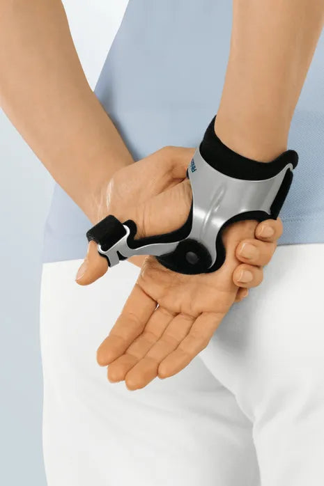 The Rhizomed is a thumb brace to provide orthopaedic support for the thumb saddle joint. It helps stabilize the thumb saddle joint and the basal thumb joint, with individual adjustment and a simple slip-on system.