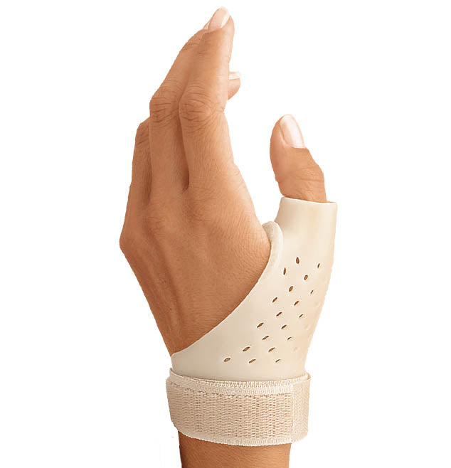 A rigid plastic orthosis for stabilizing the CMC joint and the MCP joint. No impairment of grip function and fine motor activity. Simple to mold and cut, lightweight
