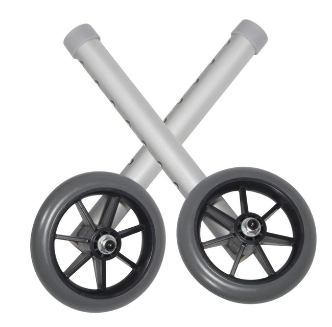 The Drive Medical Universal Walker Wheels with Rear Glides comes with 5" caster wheels and two sets of rear glides. The rubber wheels allow most walkers to roll easily and smoothly over irregular surfaces, and the rear glide caps with covers allow for use on all surface.