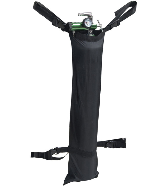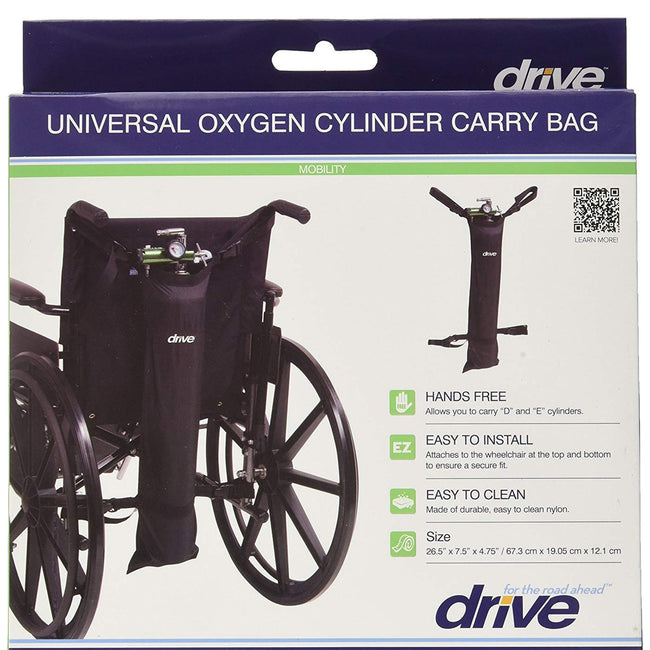 The Universal Oxygen Cylinder Carry Bag by Drive Medical is for use with "D" and "E" cylinders. The top and bottom clasps easily attaches to most manufacturers wheelchairs and has two carry handle for added convenience. It is made from durable, easy to clean, nylon.