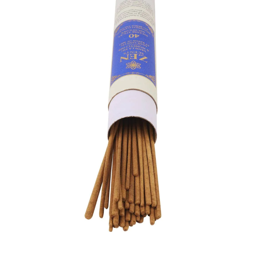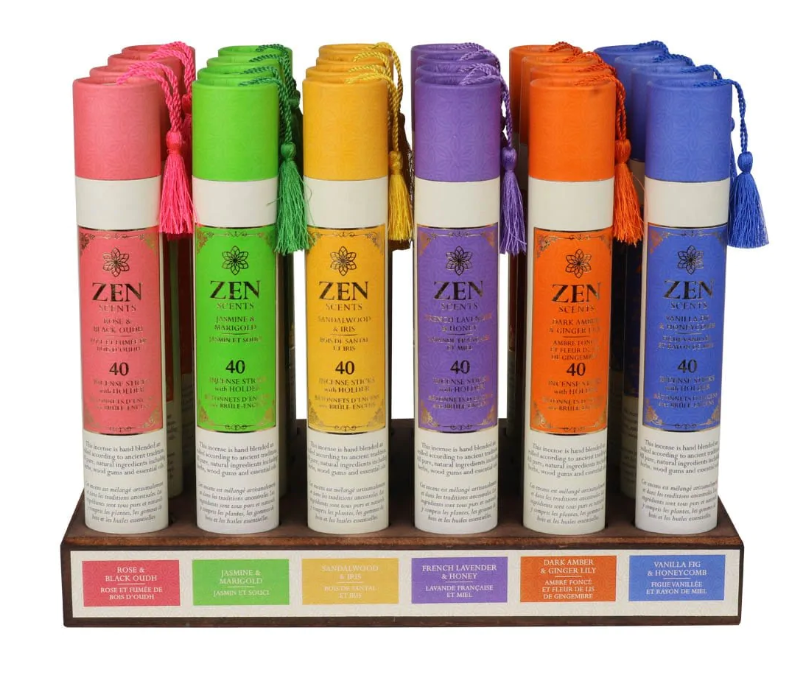 Zen Scents Incense Sticks are hand-rolled and blended in India. There are 40 incense sticks, one incense burner holder per tube. Six different scents to choose from: Rose & Black Oudh, Jasmine & Marigold, Sandalwood & Iris, French Lavender & Honey, Dark Amber & Ginger Lily, Vanilla Fig & Honeycomb.